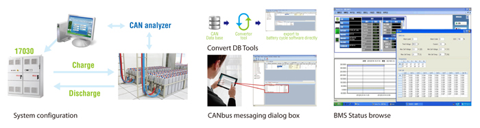 透过软体可整合通讯介面装置,在充放电过程中,读取多组的电池管理系统(BMS)的资料,其条件可转成保 护启动条件或截止条件。